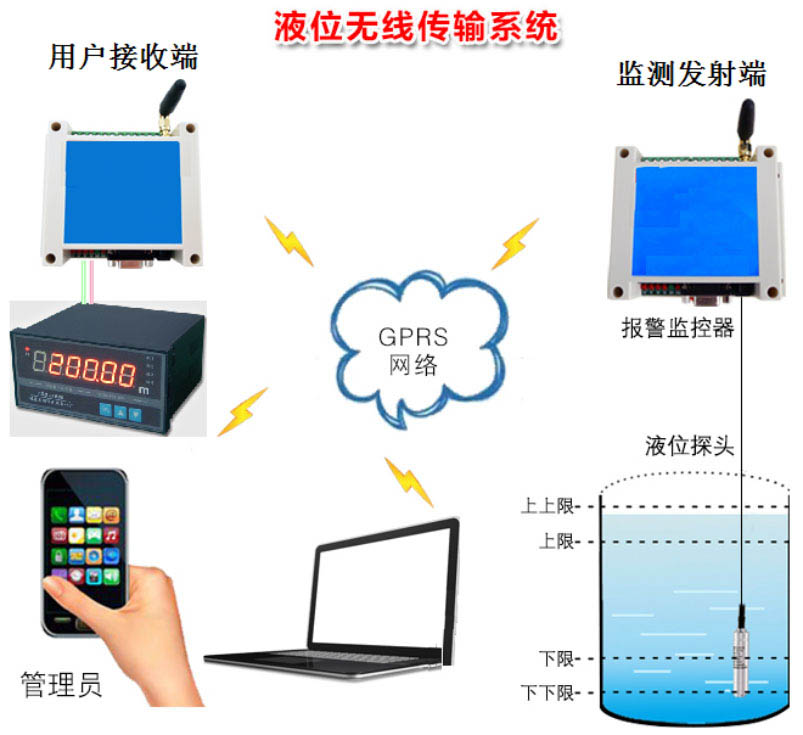 整個(gè)系統(tǒng)由監(jiān)測(cè)發(fā)射端、用戶接收端,物聯(lián)網(wǎng)云平臺(tái)幾部分組成。監(jiān)控發(fā)射端實(shí)時(shí)采集現(xiàn)場(chǎng)水位并通過GPRS 網(wǎng)絡(luò)將其傳輸至云平臺(tái),平臺(tái)獲取水位信息后將其轉(zhuǎn)發(fā)至用戶接收端,從而實(shí)現(xiàn)水位遠(yuǎn)距離傳輸。