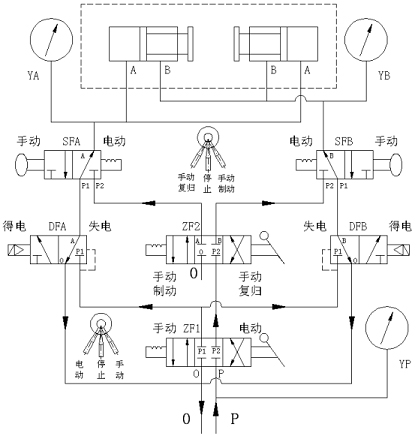 當(dāng)機(jī)組轉(zhuǎn)速為0時(shí),過(guò)1分鐘后轉(zhuǎn)動(dòng)轉(zhuǎn)閥ZF2至手動(dòng)復(fù)歸狀態(tài),排出制動(dòng)腔氣體,使壓縮氣體進(jìn)入復(fù)歸腔,復(fù)歸后轉(zhuǎn)動(dòng)轉(zhuǎn)閥ZF2至停止?fàn)顟B(tài),把手拉閥SFB至電動(dòng)位排出復(fù)歸腔氣體,排完后至手拉閥SFB于手動(dòng)位備下次手動(dòng)操作。從而實(shí)現(xiàn)對(duì)制動(dòng)器的制動(dòng)與復(fù)歸的手動(dòng)控制。