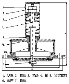 用螺絲刀旋開序號5的兩個緊定螺釘,拆開序號1護罩,按開啟真空度要求,固定序號4軸,松開序號2螺母,調(diào)整好擋塊,調(diào)完畢并緊定序號2螺母,蓋上序號1護罩,鎖緊序號5的兩個緊定螺釘。彈簧作用力在真空為5-10KPa時即能打開,當真空值超過20-30KPa時閥門全開,當閥門下部有水,靠水的浮力自動關(guān)閉。