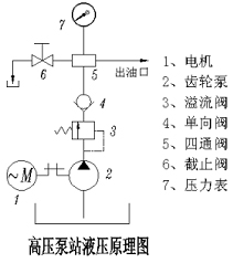 電動(dòng)機(jī)通過(guò)聯(lián)軸器直接帶動(dòng)齒輪泵泵油,壓力油經(jīng)過(guò)溢流閥調(diào)節(jié)通往單向閥到達(dá)四通集成塊,分別供給壓力表、調(diào)節(jié)截止閥和用油對(duì)象供油;