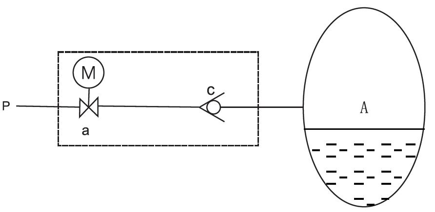 簡(jiǎn)易型自動(dòng)補(bǔ)氣裝置:工作原理如下圖所示,當(dāng)自動(dòng)補(bǔ)氣條件滿足時(shí),電動(dòng)球閥得令通電,高壓氣通過(guò)電動(dòng)球閥a、單向閥c補(bǔ)氣。此時(shí)閥位指向開啟位置,同時(shí)位置開關(guān)輸出補(bǔ)氣信號(hào)。建議采用PLC間歇補(bǔ)氣,防止補(bǔ)氣過(guò)量。電動(dòng)球閥帶手動(dòng)裝置,失電時(shí)可實(shí)現(xiàn)手動(dòng)操作。